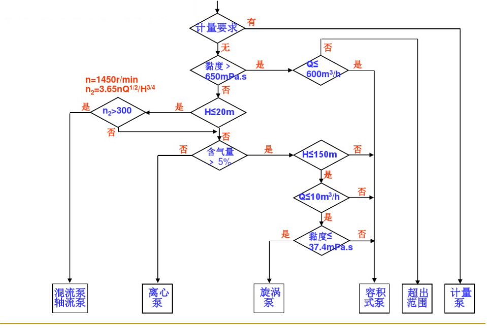 水泵的類型應(yīng)根據(jù)裝置的工藝參數(shù)、輸送介質(zhì)的物理和化學(xué)性質(zhì)、操作周期和泵的結(jié)構(gòu)特性等因素合理選擇。圖1-2為泵類型選擇框圖,可供選型時參考。根據(jù)該框圖可以初步確定符合裝置參數(shù)和介質(zhì)特性要求的泵類型。離心泵具有結(jié)構(gòu)簡單、輸液無脈動、流量調(diào)節(jié)簡單 等優(yōu)點(diǎn),因此除以下情況外,應(yīng)盡可能選用離心泵。