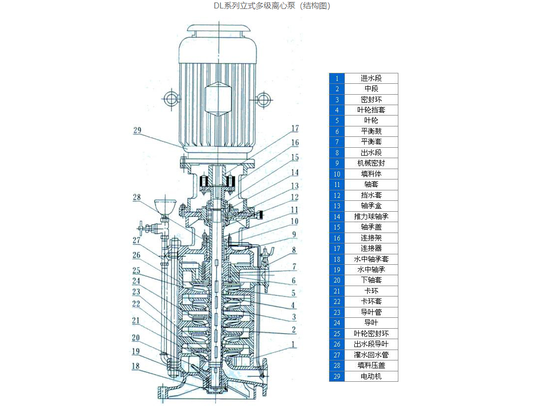 結(jié)構(gòu)說(shuō)明 DL型多級(jí)泵由電機(jī)和泵兩部分組成,電機(jī)為丫型三相導(dǎo)步電機(jī),泵和電機(jī)采用聯(lián)軸器連接,整體為剛性連接,使用吋無(wú)需校正泵由定子部分利轉(zhuǎn)子部分組成泵定子部分由進(jìn)水段、中段、導(dǎo)葉、出水段、填料函體等零件組成為防止定子磨損,定子上裝有密封環(huán)、平衡等,磨損后可用備件更換轉(zhuǎn)子部分由軸、葉輪,平衡鼓等組成轉(zhuǎn)子下端為水潤(rùn)滑軸承,上部為角接觸球軸承,泵的軸向力絕大部分由平衡鼓來(lái)承擔(dān),其余小部分殘余軸向力由角接觸球軸承來(lái)承受進(jìn)水段、中段和出水段的結(jié)臺(tái)面用紙墊通過(guò)拉緊達(dá)到密封.軸封采用填料或機(jī)械密封.用戶可根據(jù)需要選擇。泵旋轉(zhuǎn)方向從驅(qū)動(dòng)端向下看為逆時(shí)針?lè)较蜣D(zhuǎn)動(dòng)。